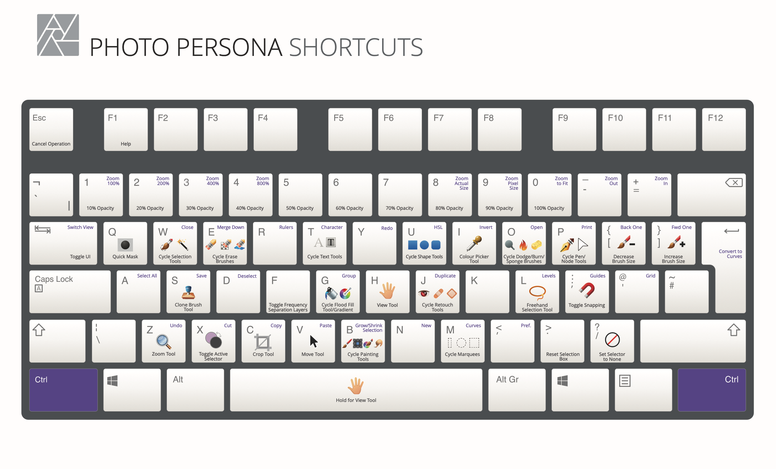 외국의 매뉴얼은 글자보다는 이미지로 구성이 많이 되어 있는 것 같습니다. 이제 하단에는 윈도우+맥과 아이패드로 나누어서 단축키 정리를 해보도록 하겠습니다. 어피니티는 페르소나 별로 단축키를 따로 제공하며, 일단은 포토 페르소나 단축키 먼저 정리하도록 하겠습니다(아이패드는 차후에). 순서는 키보드 배열에 따라 작성하였습니다.