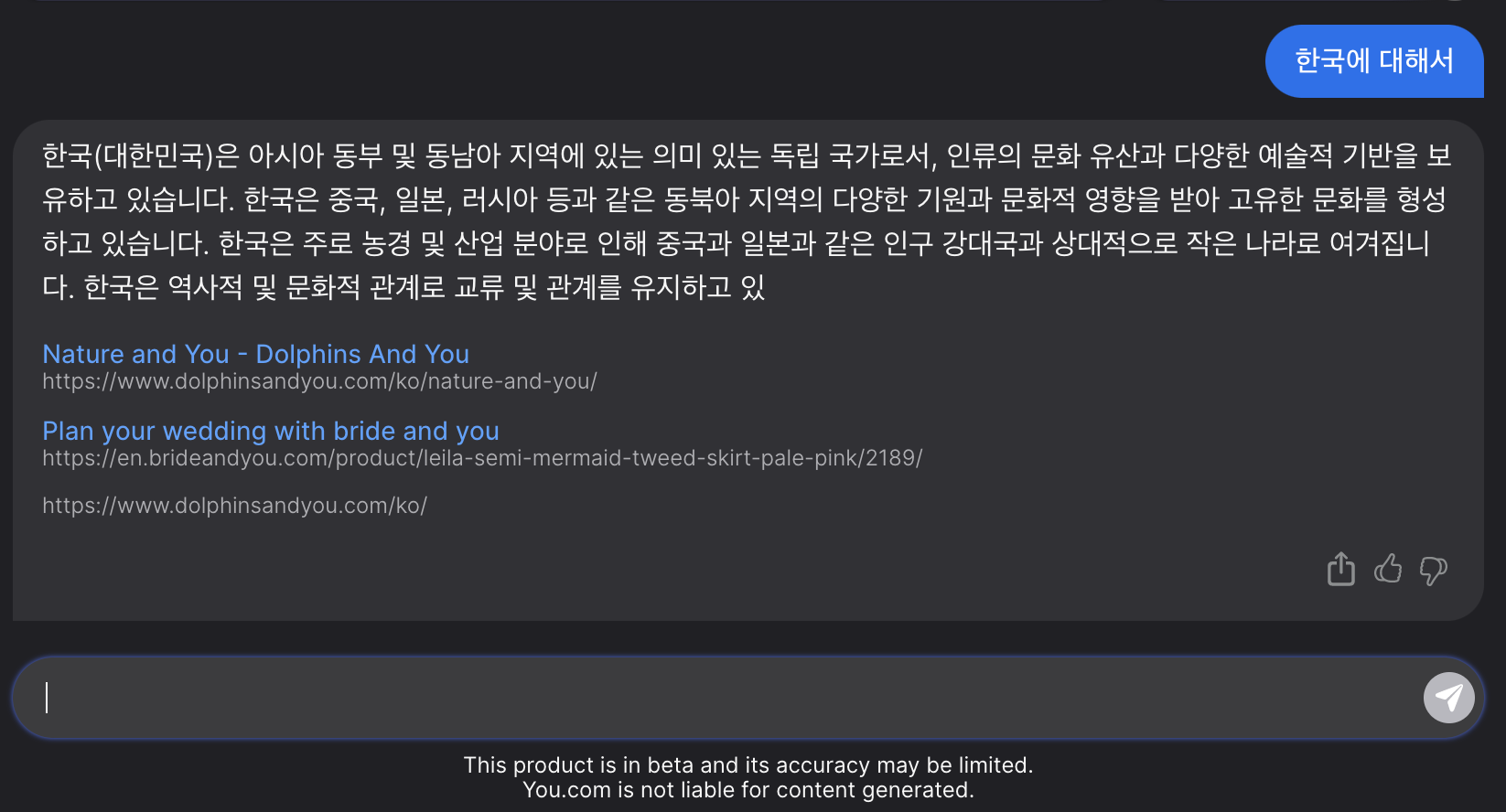 '한국에 대해서'를 입력을 하면 아래 사진처럼 출력합니다.